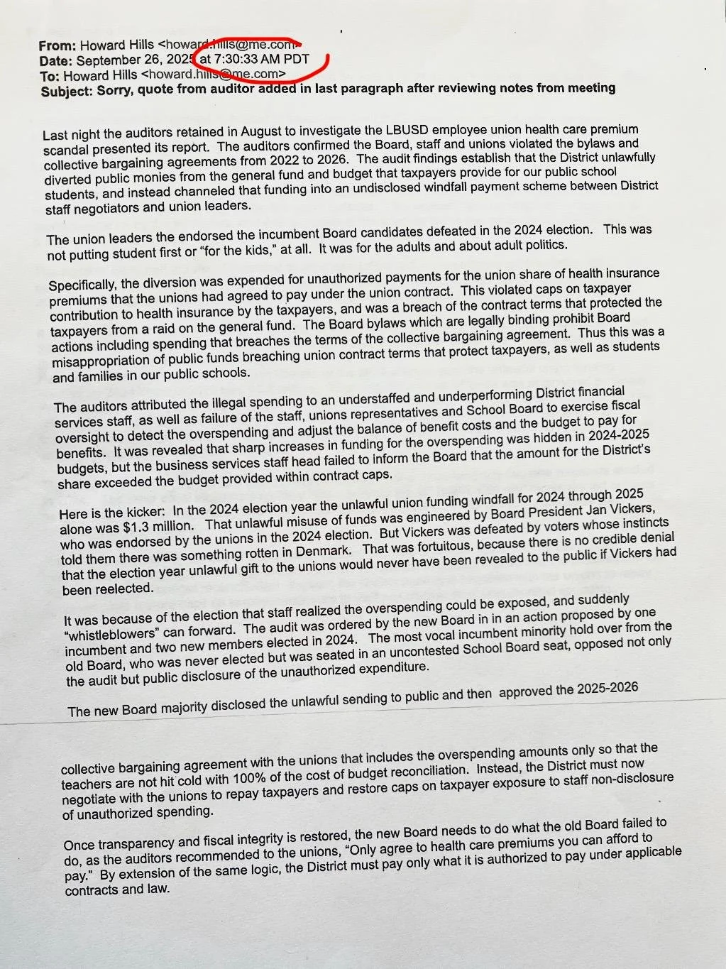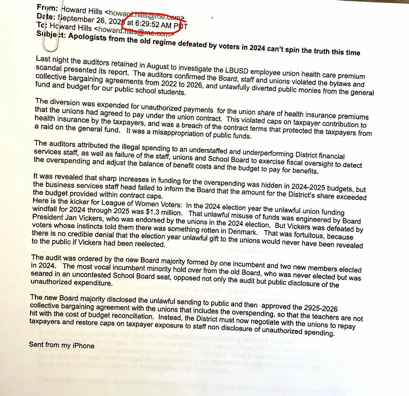 In late September, Trustee Howard Hills circulated two versions of a letter containing allegations about district finances, staff, and former board members. The tone and content of the letter prompted concern across the community, leading to 27 pages of public comment submitted at the October 9 Board Meeting. Many employees described feeling unsafe and disheartened by the rhetoric.